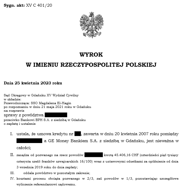 Umowa kredytu zawarta z Bankiem BPH nieważna- wyrok Sądu Okręgowego w Gdańsku z 25.04.2023 r. w sprawie o sygn. XV C 401/20